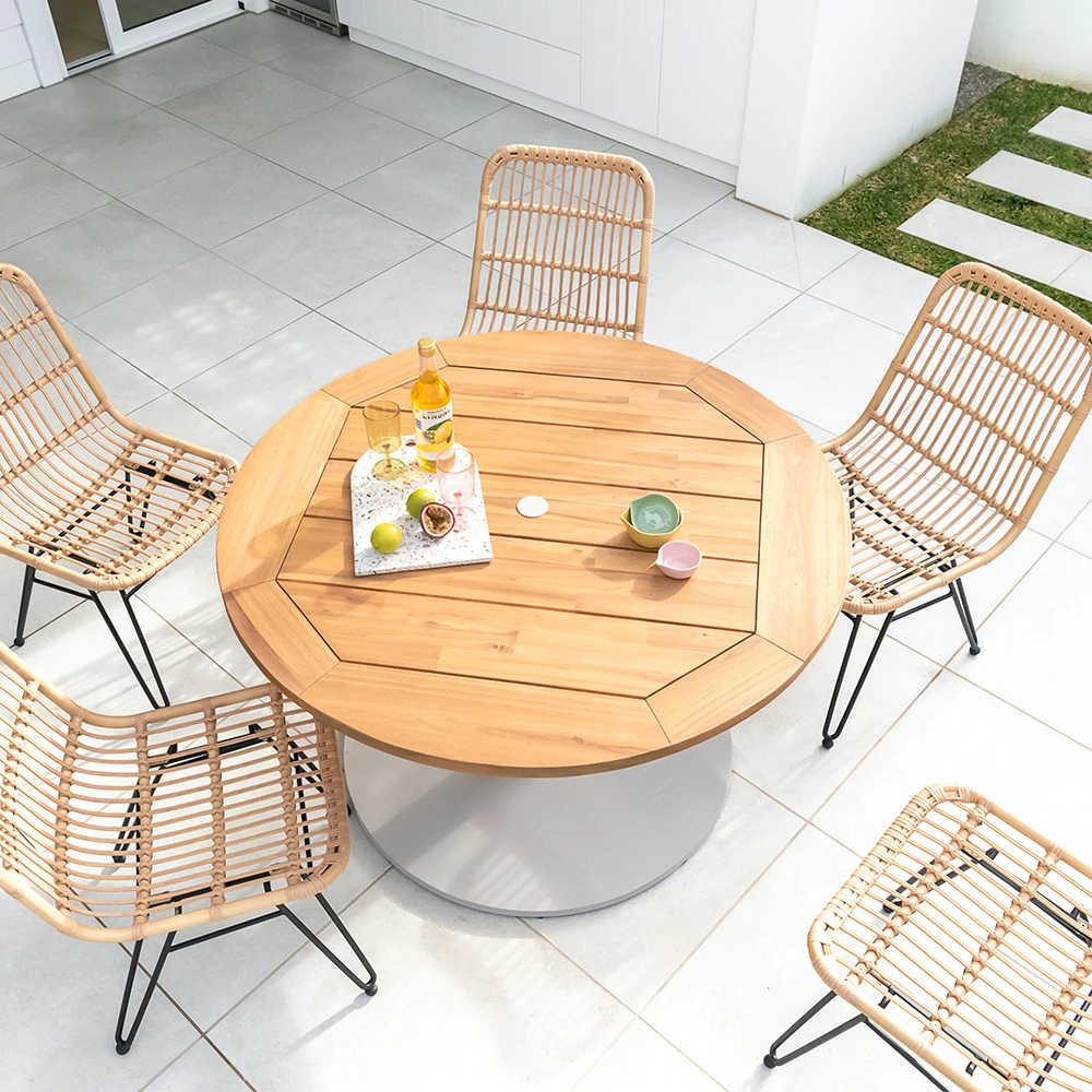 Elevate alfresco dining with this elegant round table, crafted from rich acacia timber atop a sculptural steel base – where timeless warmth meets modern sophistication.